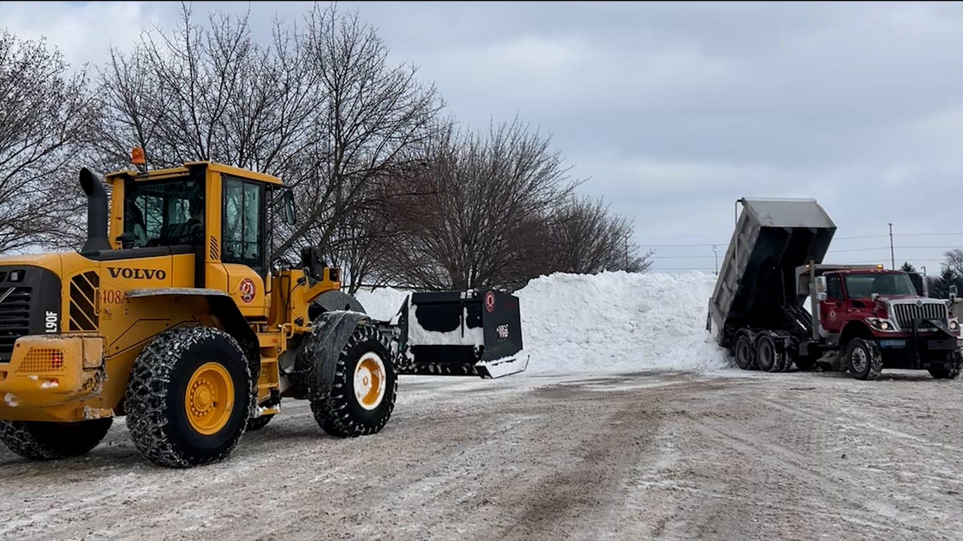 Columbus snow plows push snow to the center of the road, then Franklin County trucks haul the snow to the parking lot at McCoy Park.