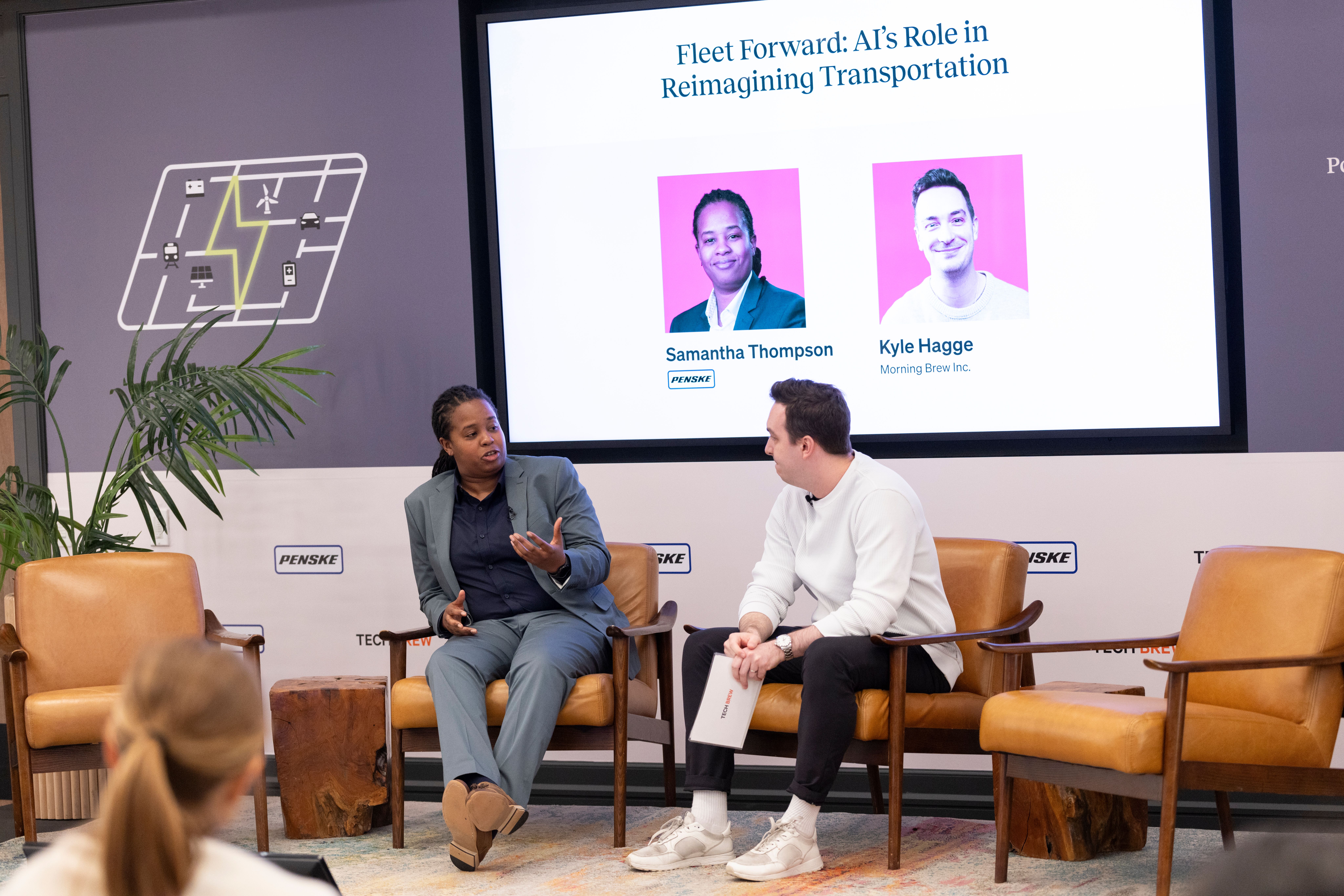 Featuring conversations on the intersection of energy and transportation—and a crowd full of execs, industry leaders, and up-and-coming professionals—Morning Brew Inc.’s own Kyle Hagge chatted with Samantha Thompson, VP of customer success and fleet telematics at Penske Transportation Solutions.